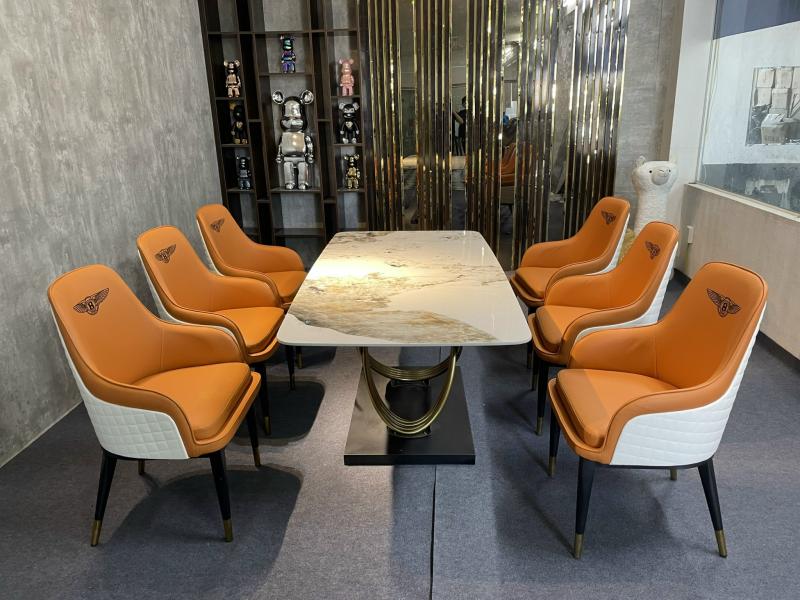 Bàn ăn channel đế đen 1,8m, mặt đá ceramic chống xước chống ố, ghế bentley chân sắt bọc đồng.